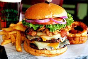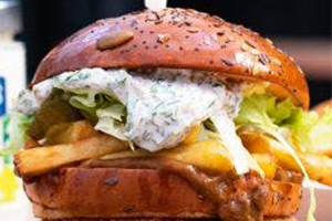 Big Daddy club sandwich with fried chicken, onions, lettuce and our signature sauce. Good enough for two people.