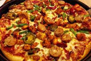 A pizza under an overload of golden corn, black olives, crunchy onions, crisp capsicum succulent mushrooms, grilled paneer and jalapeno with extra cheese to go all around.