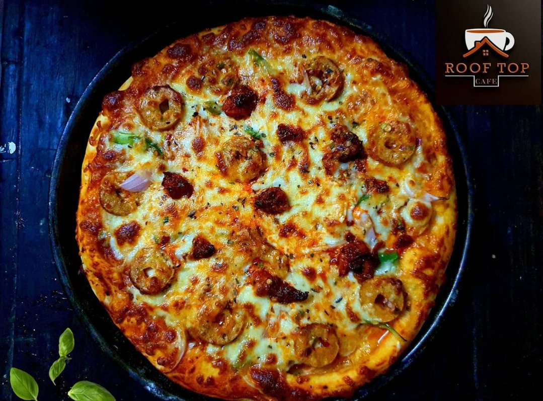 A Pizza classic with onion, capsicum, and extra cheese yummy rooftop cafe's pizza sauce. purely vegetarian.